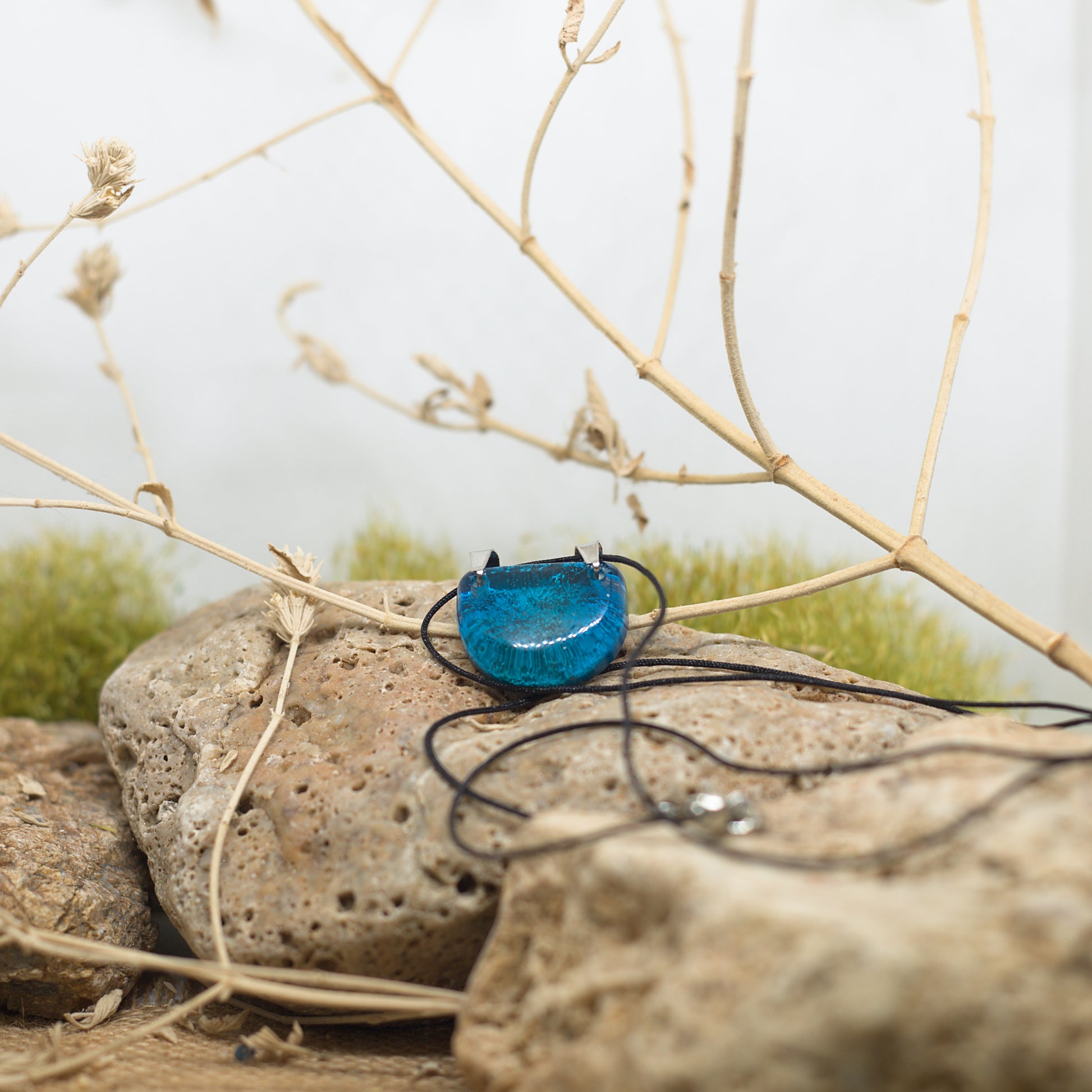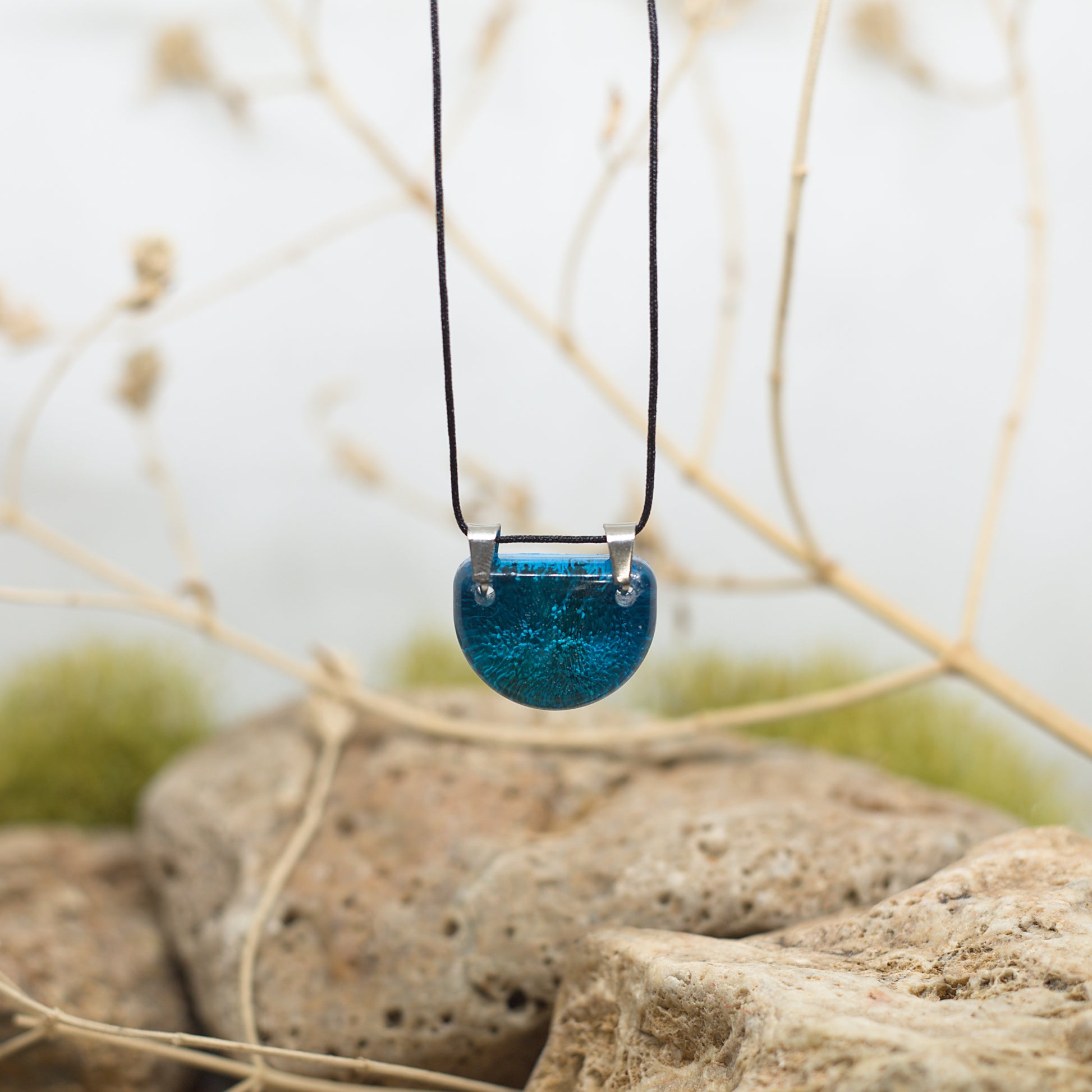 Колие с медальон, в който сини игриви форми са уловени в прозрачна смола.
