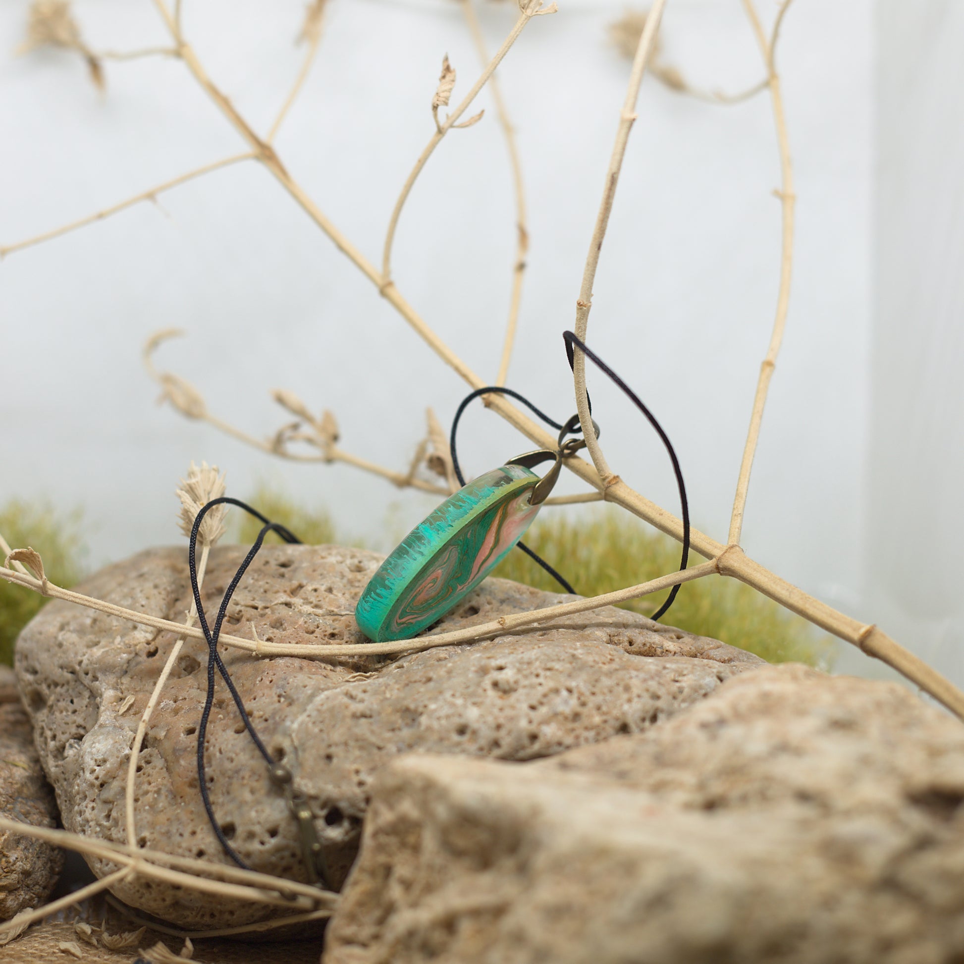 Колие с медальон в нежни зелено-розови нюанси, преливащи и оживяващи с всяко движение на светлината.