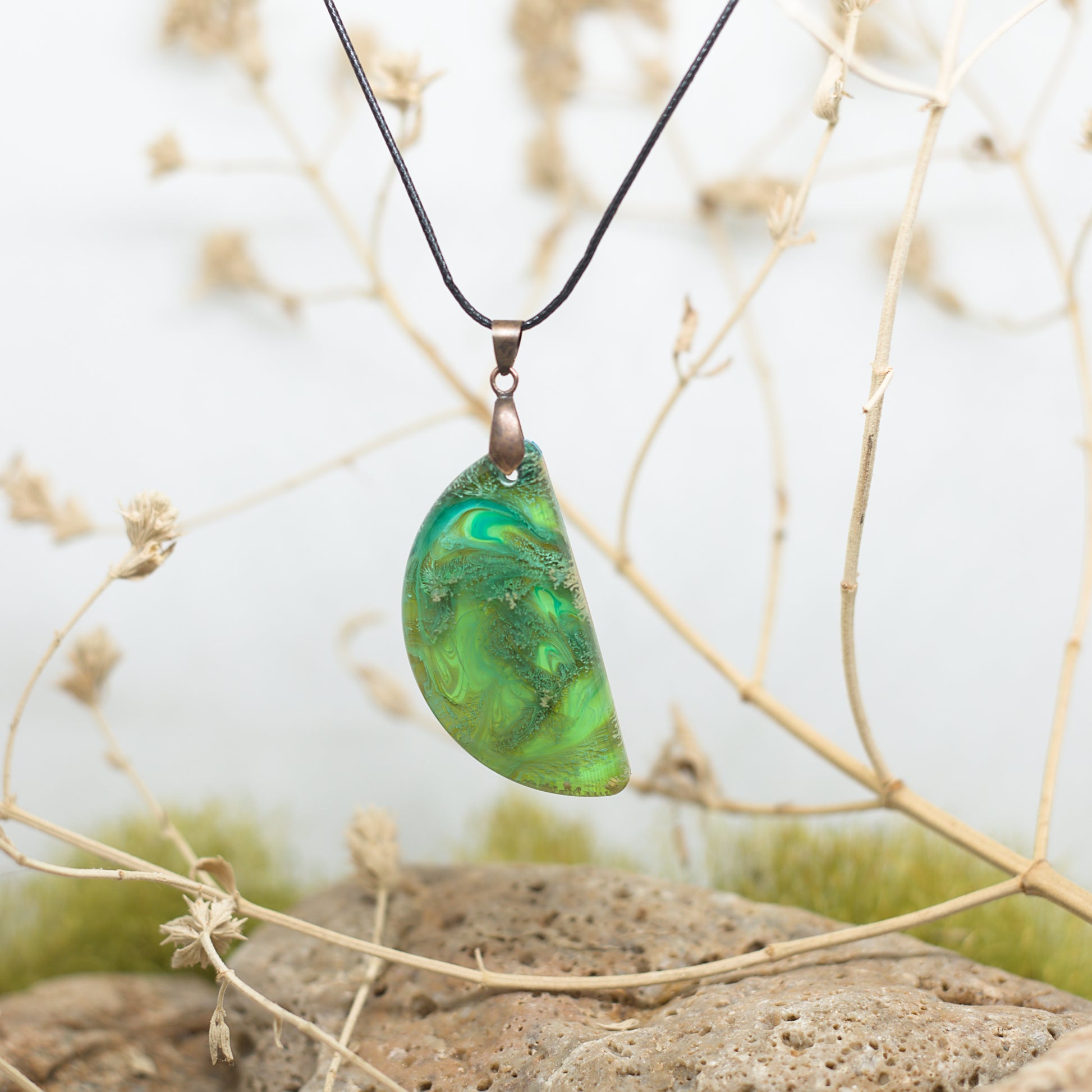 Колие с медальон, в който нежни зелени форми са уловени в прозрачна смола.