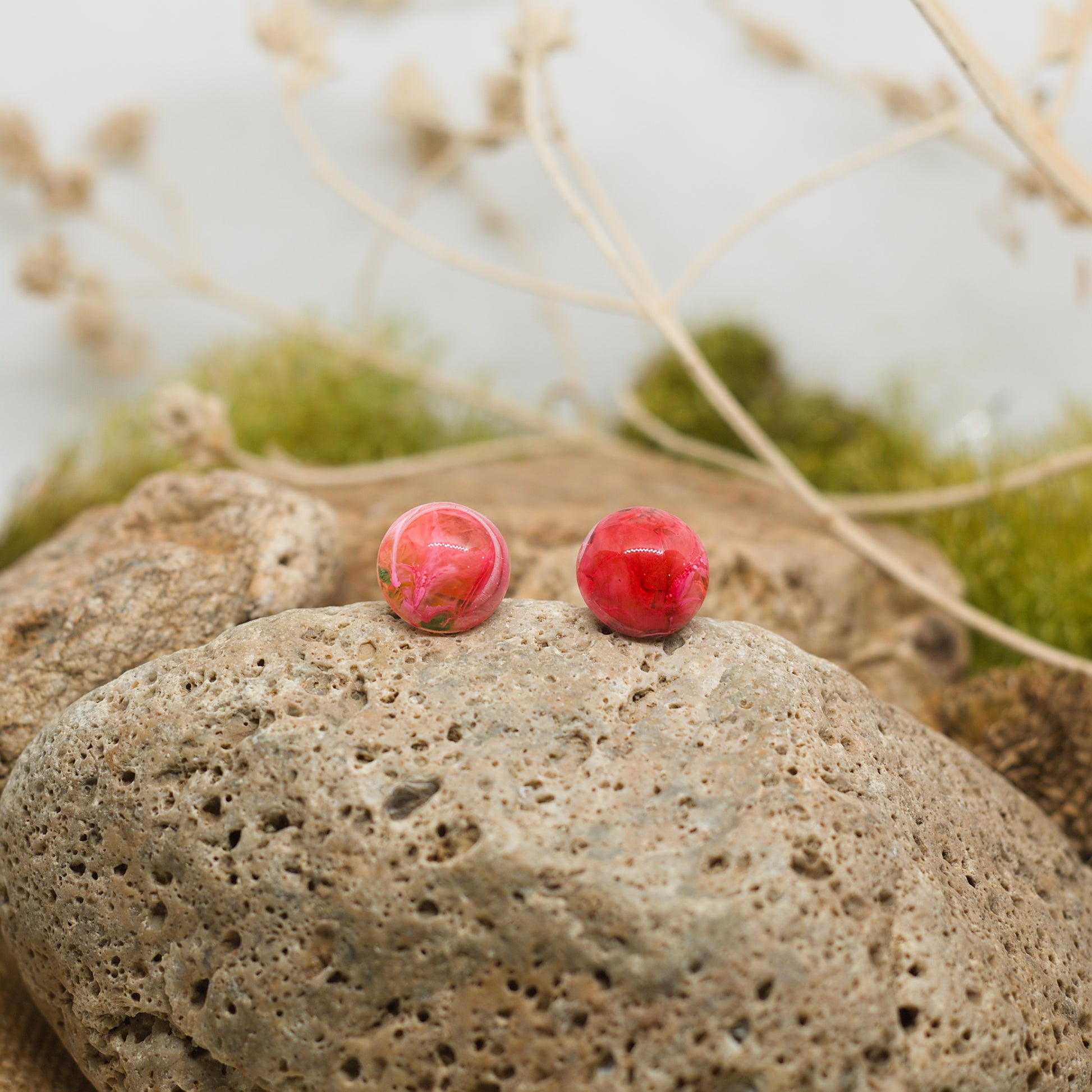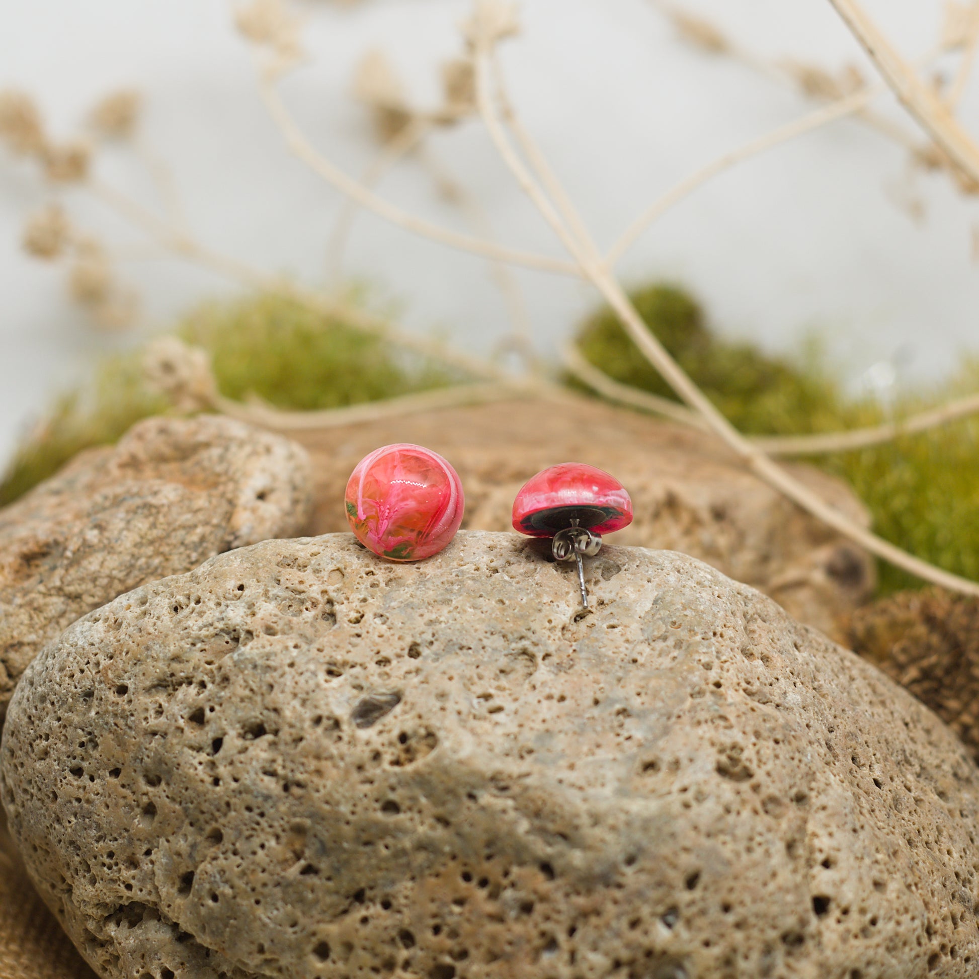 Кръгли обеци на винт с преливащи червено-розови нюанси. Ефирни и женствени, цветовете се сливат меко и улавят светлината, създавайки изразителен акцент, който придава финес и настроение на всяка визия.
