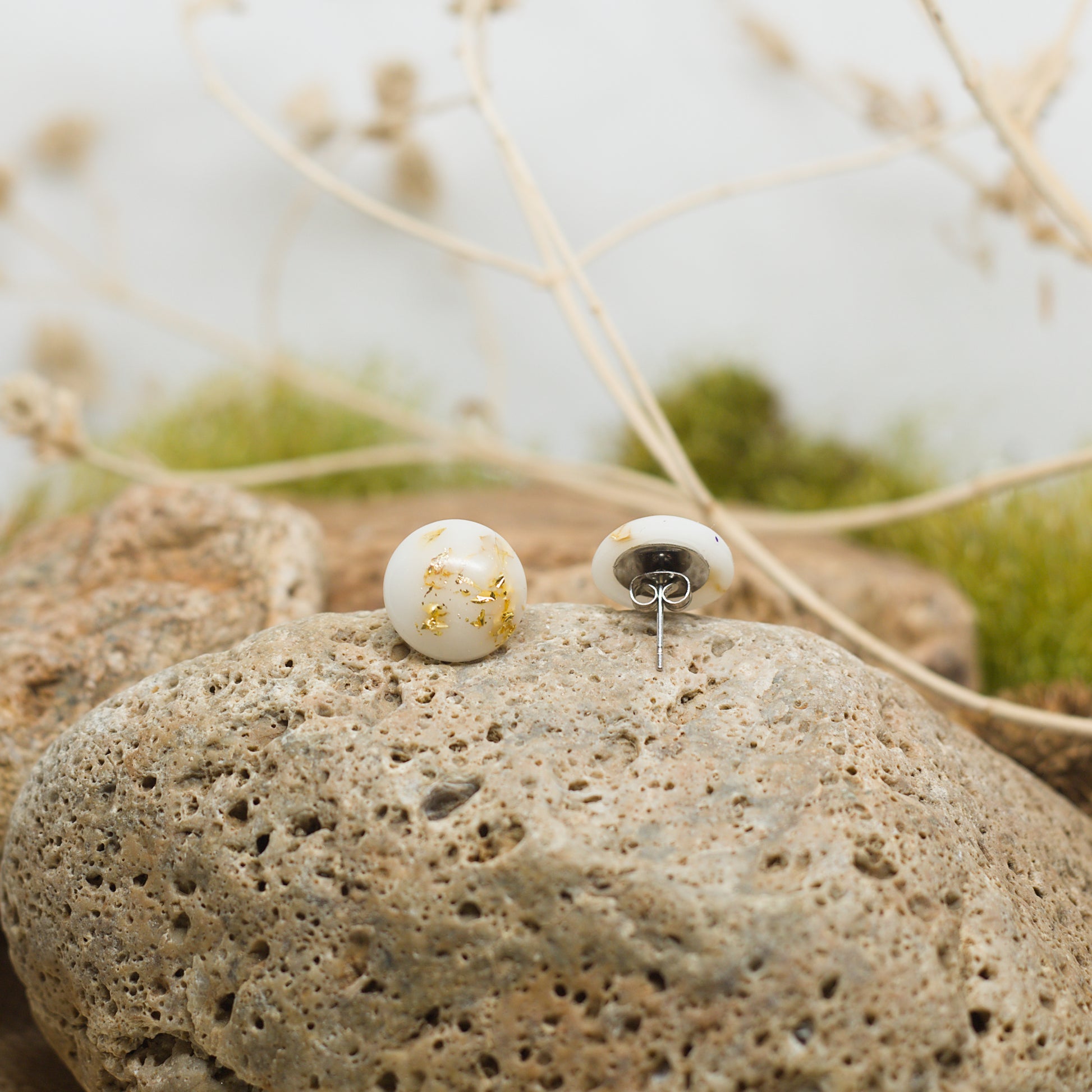 Малки кръгли обеци на винт с плътно покритие в бяло и златисто. Нежните, топли нюанси създават усещане за елегантност и деликатен блясък, а компактната форма добавя фин и изразителен акцент към всяка визия. Перфектни за ежедневието или специални поводи.