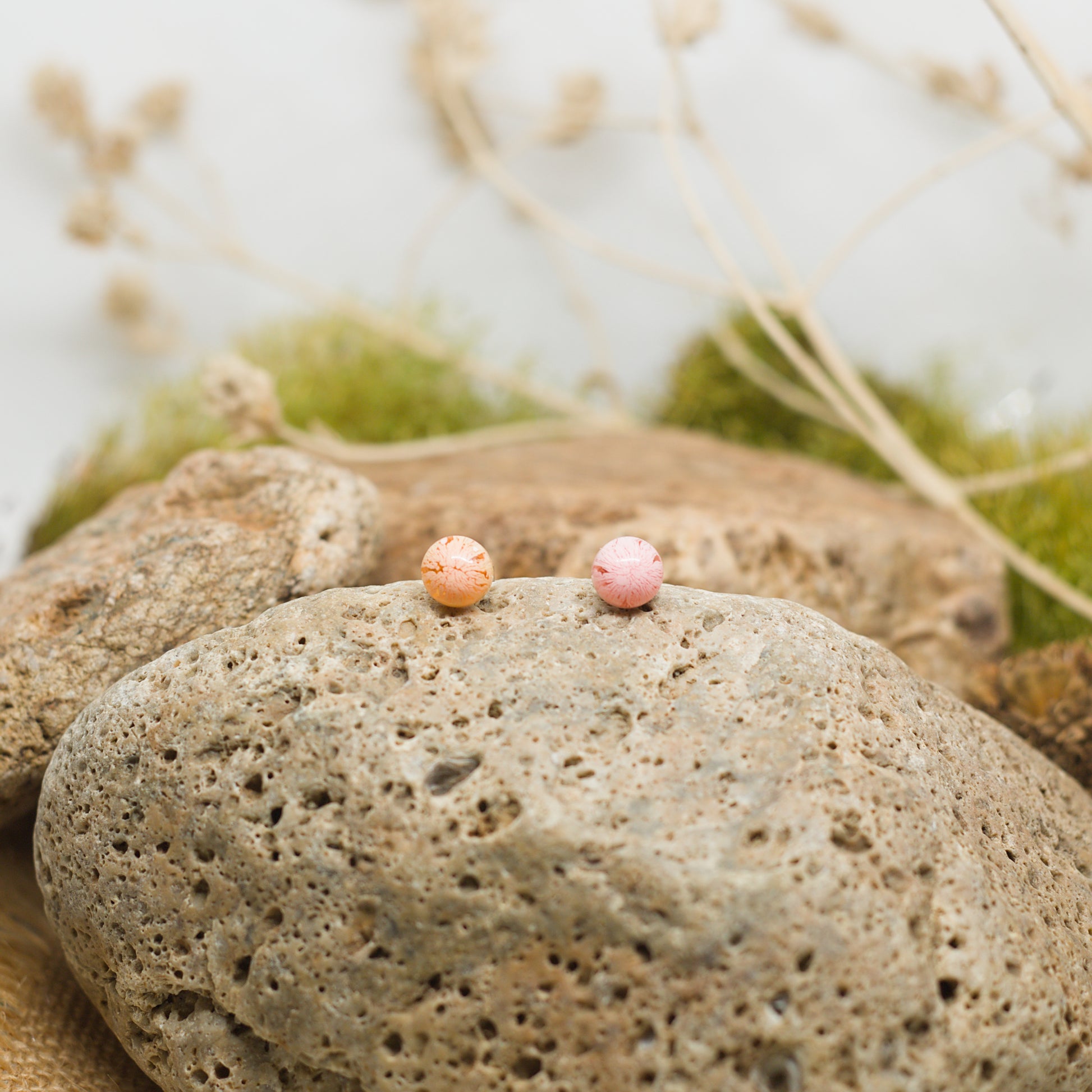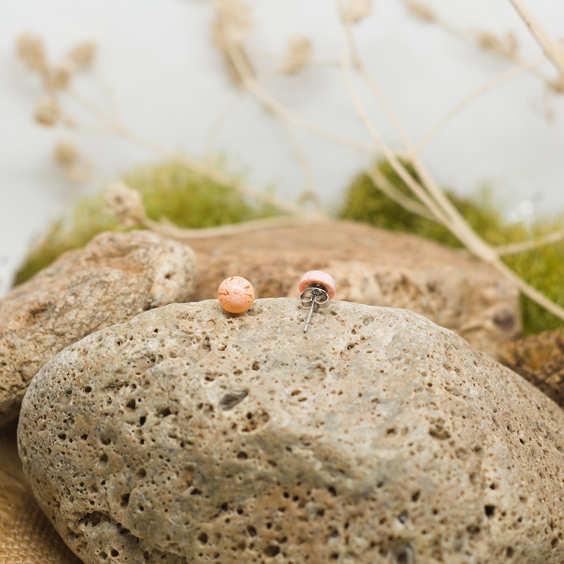Малки кръгли обеци на винт в розово и телесен нюанс, които стоят леко и удобно на ухото. Комбинацията от деликатни и наситени тонове създава усещане за финес с щипка смелост, като малък акцент, който придава индивидуалност и настроение на всяка визия.